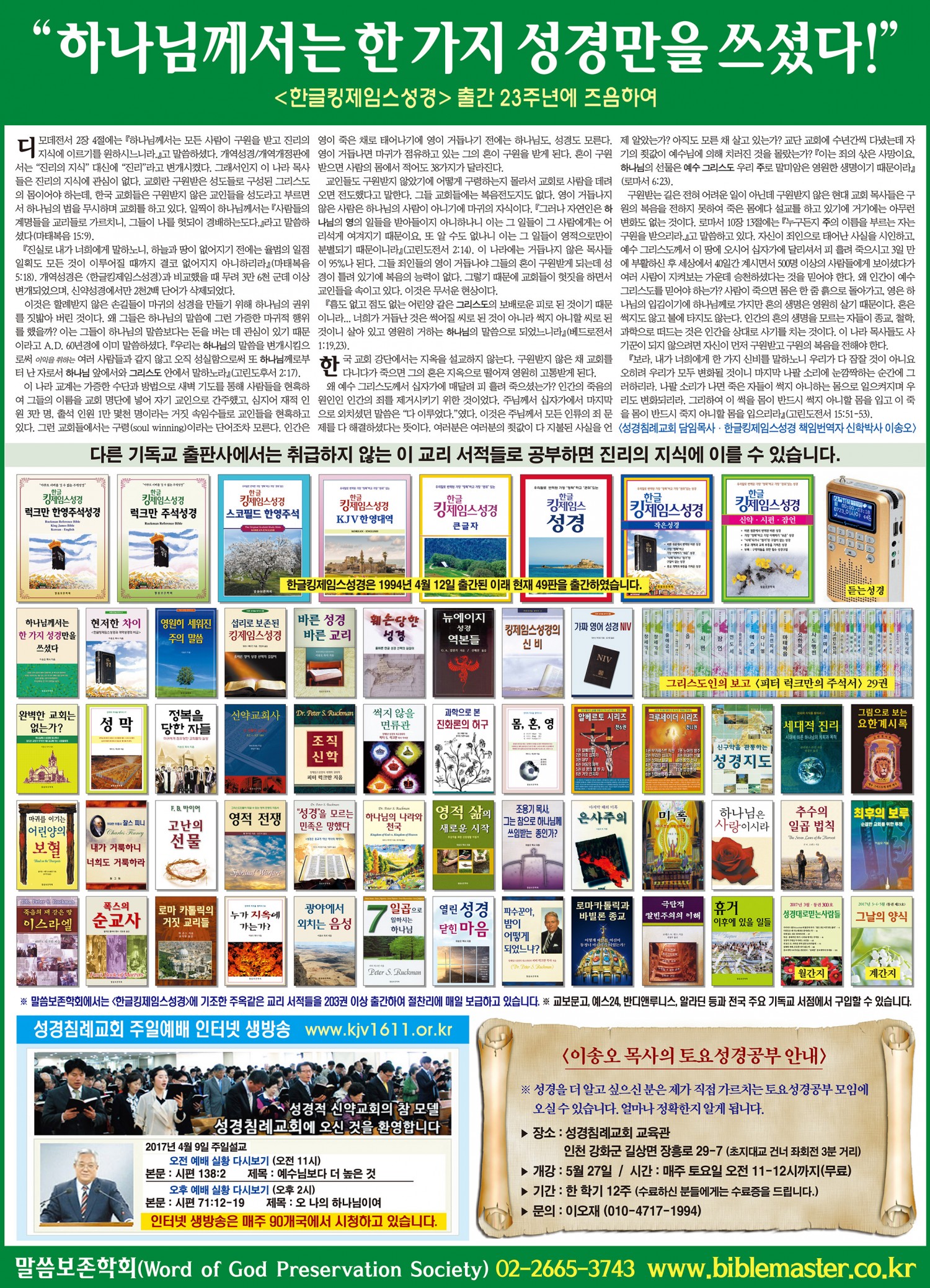 "하나님께서는 한 가지 성경만을 쓰셨다!" <한글킹제임스성경>출간 23주년에 즈음하여 - 2017년 4월 12일 조선일보 전면광고 작성자 정보 최고관리자 작성 작성일 2025.10.10 11:14 컨텐츠 정보 377 조회 목록 본문 . SNS 공유 관련자료 이전 "내 백성이 지식의 부족으로 멸망하는도다. 네가 지식을 거부하였으므로 나도 또한 너를 거부하리니" <한글킹제임스성경> 출간 24주년에 즈음하여 - 2018년 4월 5일자 동아일보 전면광고 작성일 2025.10.10 11:16 다음 "개역개정판으로는 개혁도 부흥도 일어날 수 없다!" <한글킹제임스성경>출간 22주년에 즈음하여 - 2016년 4월 12일 동아일보 전면광고 작성일 2025.10.10 11:03 댓글 0 등록된 댓글이 없습니다. 로그인한 회원만 댓글 등록이 가능합니다. 목록