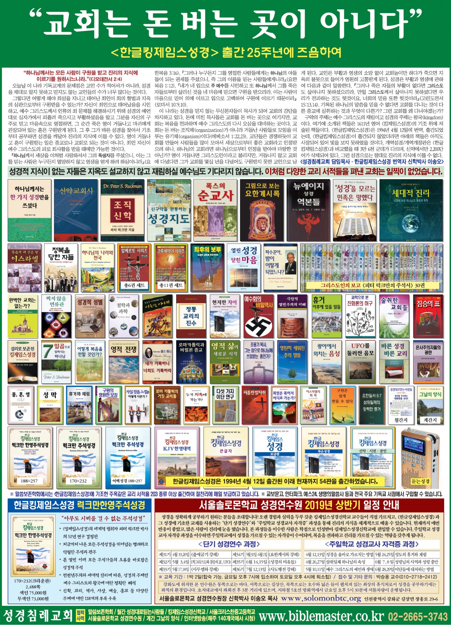 한글킹제임스성경 출간 25주년 전면광고(2019년 4월 12일자 동아일보) 작성자 정보 최고관리자 작성 작성일 2025.10.10 11:16 컨텐츠 정보 403 조회 목록 본문 . SNS 공유 관련자료 이전 한글킹제임스성경 출간 26주년 전면광고(2020년 4월 10일자 동아일보) 작성일 2025.10.10 11:17 다음 "내 백성이 지식의 부족으로 멸망하는도다. 네가 지식을 거부하였으므로 나도 또한 너를 거부하리니" <한글킹제임스성경> 출간 24주년에 즈음하여 - 2018년 4월 5일자 동아일보 전면광고 작성일 2025.10.10 11:16 댓글 0 등록된 댓글이 없습니다. 로그인한 회원만 댓글 등록이 가능합니다. 목록