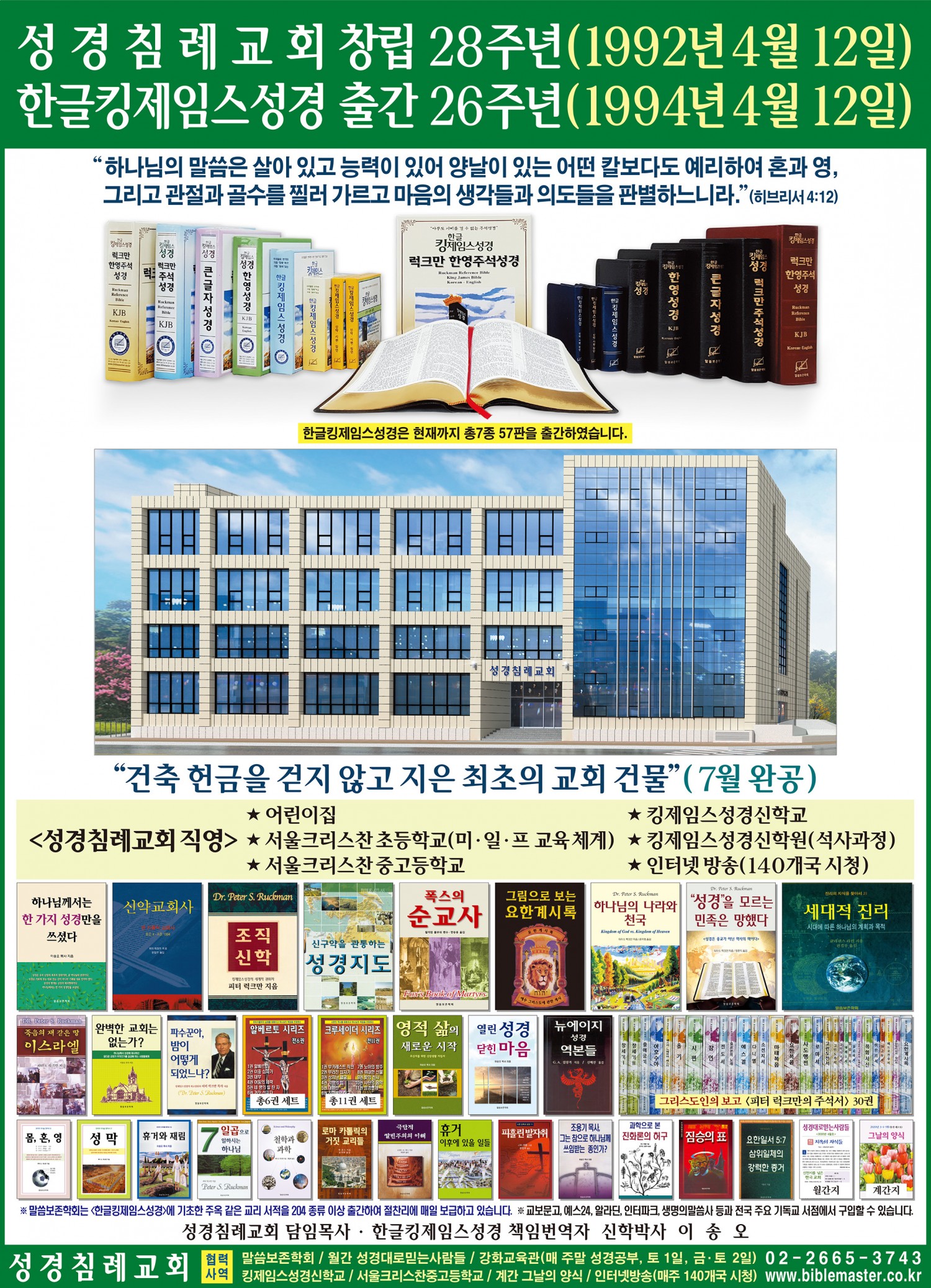 한글킹제임스성경 출간 26주년 전면광고(2020년 4월 10일자 동아일보) 작성자 정보 최고관리자 작성 작성일 2025.10.10 11:17 컨텐츠 정보 348 조회 목록 본문 . SNS 공유 관련자료 이전 성경침례교회 창립 29주년, 한글킹제임스성경 출간 27주년 전면광고(2021년 4월 12일자 동아일보) 작성일 2025.10.10 11:17 다음 한글킹제임스성경 출간 25주년 전면광고(2019년 4월 12일자 동아일보) 작성일 2025.10.10 11:16 댓글 0 등록된 댓글이 없습니다. 로그인한 회원만 댓글 등록이 가능합니다. 목록